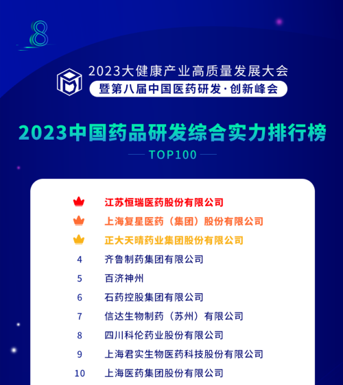 由药智网、中国药业杂志社主办的2023大健康产业高质量发展大会暨第八届中国医药研发•创新峰会于6月16日开幕,会上发布了《2023中国药品研发实力排行榜》系列榜单,永利娱乐城医药凭借深厚的创新研发实力再创辉煌:荣登《2023中国药品研发综合实力排行榜TOP100》榜首、《2023中国化药研发实力排行榜TOP100》榜首。值得一提的是,今年是永利娱乐城医药连续第6年入选《中国药品研发综合实力排行榜》榜首。